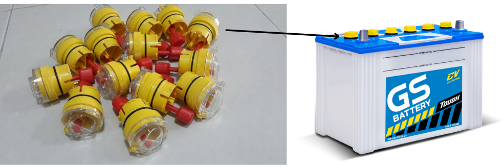 5. ฝาปิดเซลล์ หรือฝาปิดช่องเติมน้ำกรด ฝานี้จะมีรูระบายก๊าซไฮโดรเจนที่เกิดจากปฏิกิริยาทางเคมีภายในแบตเตอรี่ให้สามารถระบายออกไปได้ ถ้าไม่มีรูระบายนี้เมื่อเกิดปฏิกิริยาเคมี ก๊าชไฮโดรเจนจะไม่สามารถระบายออกไปได้ ทำให้มันเกิดแรงดันดันจนแบตเตอรี่เกิดการระเบิดได้